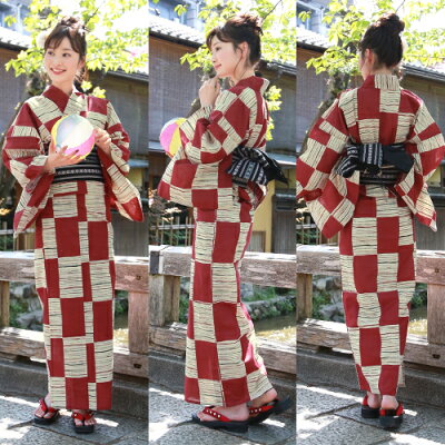 浴衣 セット レトロ 高級綿麻浴衣3点セット「生成りと赤の市松模様に縞」浴衣 生成り 赤 市松 古典柄 大人 女性 女 2021 Sサイズ